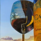 The bottle and metal glass are rendered using acrylic pouring method, creating a dynamic and fluid appearance that contrasts beautifully with the meticulously detailed elements done in traditional oil. The letters on the bottle, the bottle opener, the radiant sunset, and the expansive sky are painted with exquisite precision, showcasing Monica’s exceptional skill and dedication to her craft.