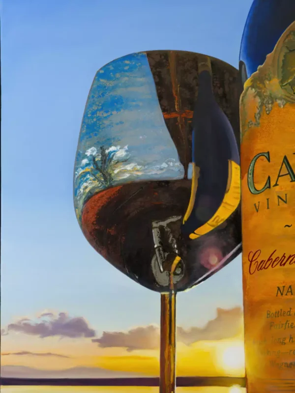 This 30×40 inch painting captures a tranquil sunset by the water, where a bottle of Caymus