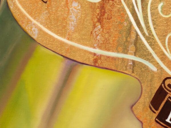 The painting showcases the upper part of a Cristal Champagne bottle, an emblem of refinement and celebration. The subject is rendered with an astounding level of detail, each curve, contour, and reflective surface brought to life with traditional oil painting techniques. The bottle’s cap and the neck glisten with realism, their textural elements so tangible that one can almost feel the cool metal and glass under their fingertips.