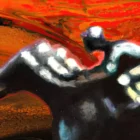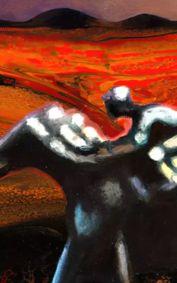 At the heart of the composition, Monica has rendered an impeccably detailed bottle of Blanton’s, the original single barrel bourbon whiskey. The label and signature horse stopper are depicted with remarkable precision. The warm amber hues of the bourbon mirror the ethereal, fiery backdrop, evoking the spirit’s rich and mellow flavors. The bourbon’s essence spills over into the viewer’s space, with a series of sculptures embodying the vigor and grace of Kentucky’s equestrian heritage.