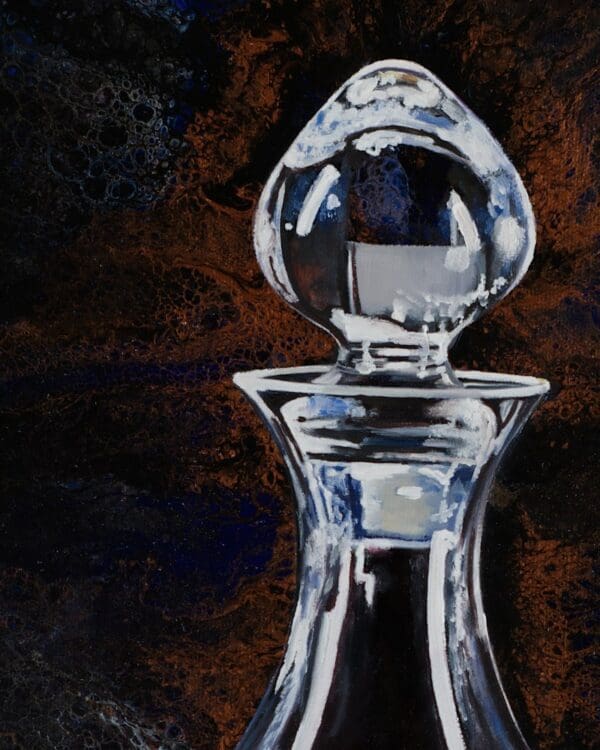 This Wine Decanter is a radiant masterpiece, with the background expertly crafted using acrylic pouring techniques. The decanter and wine within it are depicted in traditional oil medium, adding depth and detail to the scene. The overall result is a stunning work of art that captures the essence of wine and the joy it brings to our lives.
