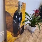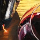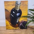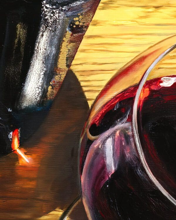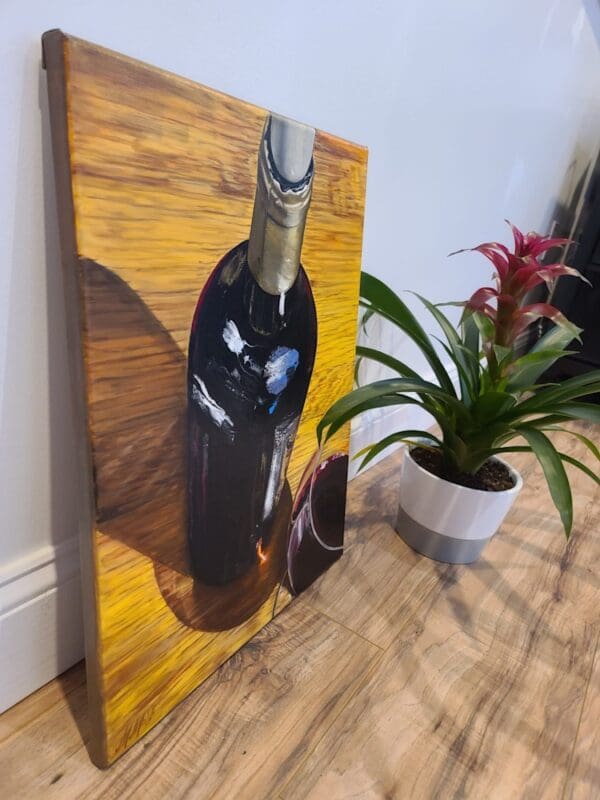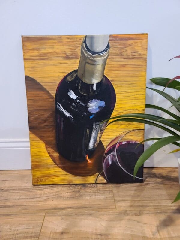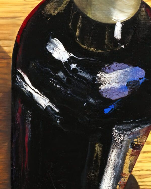 The wine and bottle and wine are done in acrylic pouring and the wine glass, and background are done in traditional oils.
