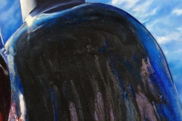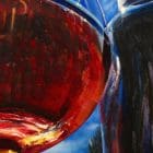 This large framed painting is from a picture taken during a summer bbq. The red wine and bottle is done in acrylic pouring and the wine glass, sun, reflections, and background are done in traditional oils.